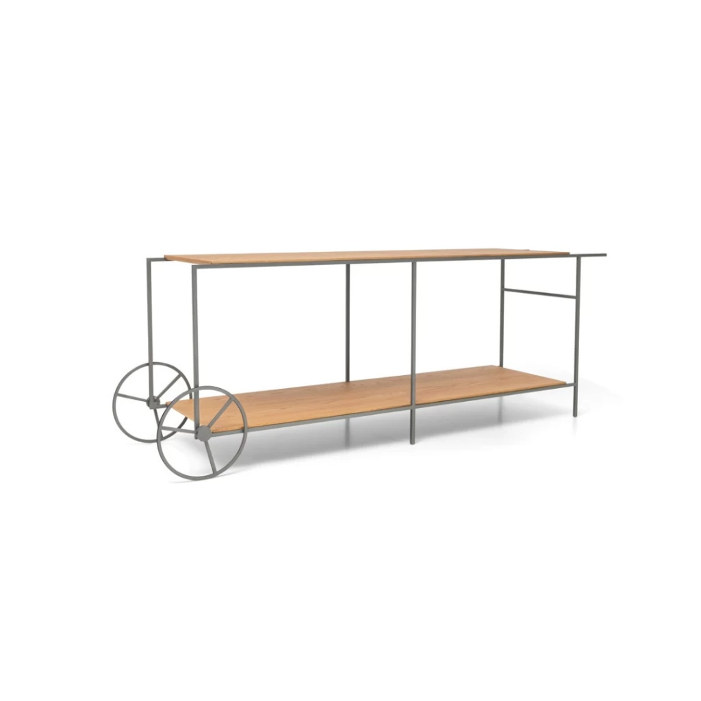 Se a ideia de simplicidade e desenho limpo faziam sentido no carro de chá, a versão aparador deste modelo reforça ainda mais a proposta de praticidade e independência. Uma peça sem excessos, na medida para espaços contemporâneos com personalidade.
