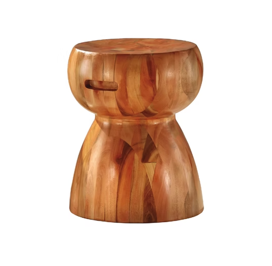 Remetendo ao formato de uma rolha, o banco Champagne possui pegas laterais que auxiliam a carregar a peça com mais facilidade. Na foto você vê o Champagne na madeira natural Amêndoa Suave.