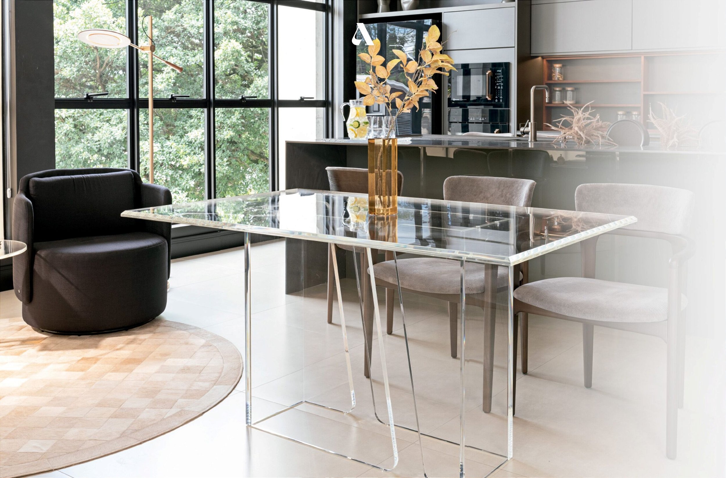 A Linha Atlântica traz a imponência e a serenidade do oceano para o coração da sua casa. Com mesas de feitas em acrílico translúcido, a linha combina robustez e leveza em um design que reflete o movimento fluido das águas.