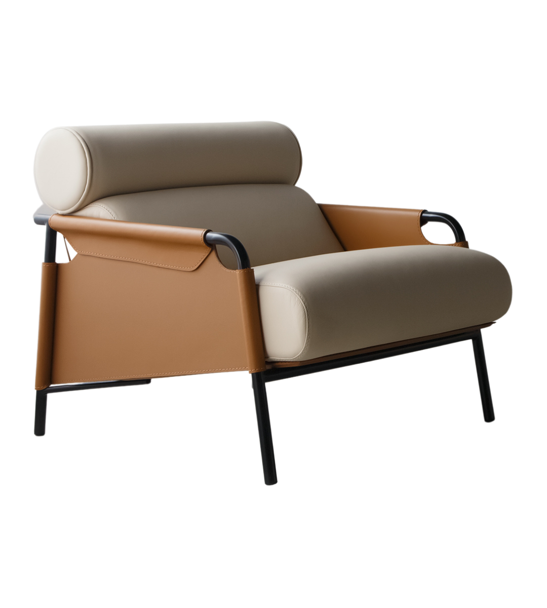 Poltrona em metal com couro natural e assento estofado. Os produtos em couro natural possuem design diferenciado, com peças divididas e detalhes em costura.